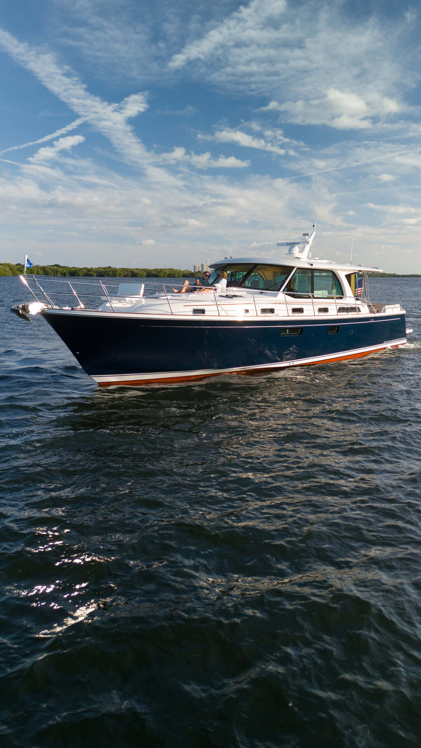 A statement of refined taste and timeless craftsmanship. Cruise comfortably with two staterooms and two heads.