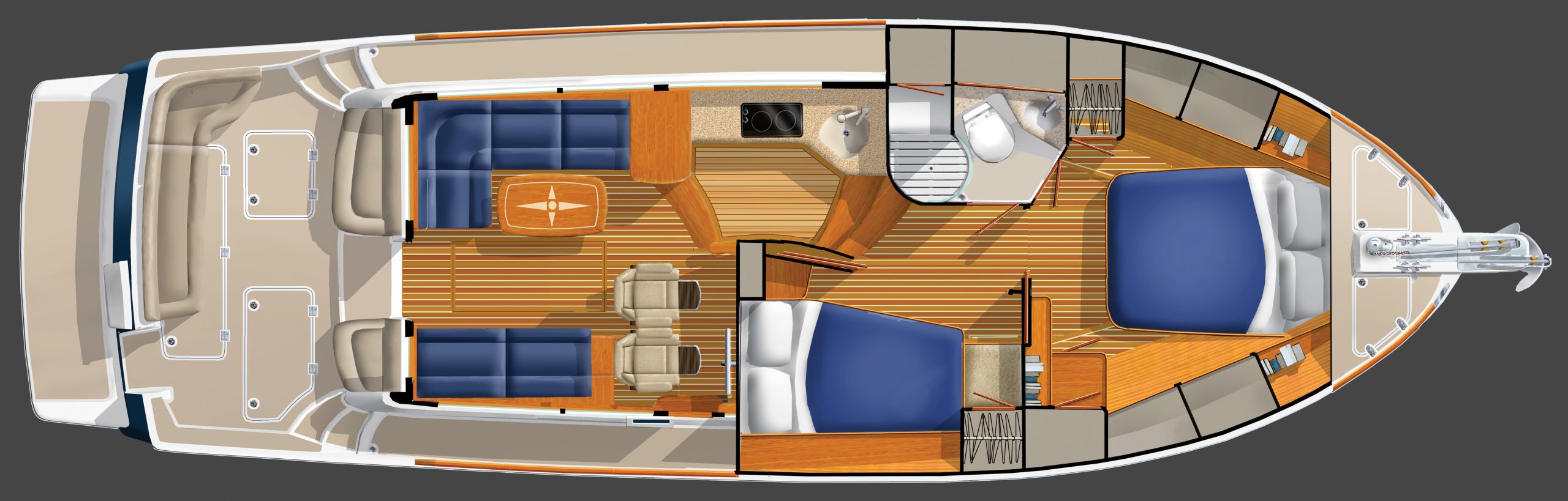 A second dinette converted to a guest berth with pocket doors for privacy, making this model a standout for both comfort and style.